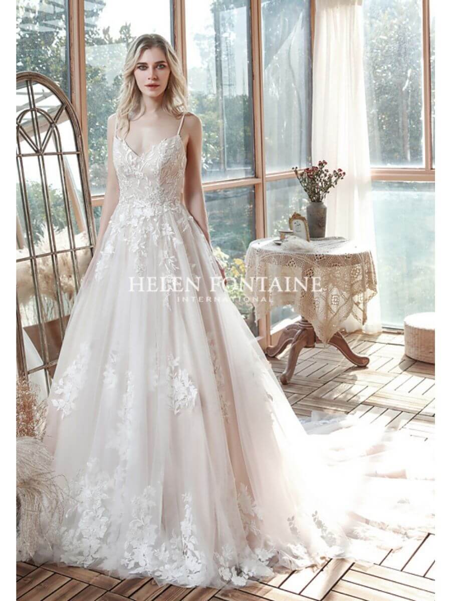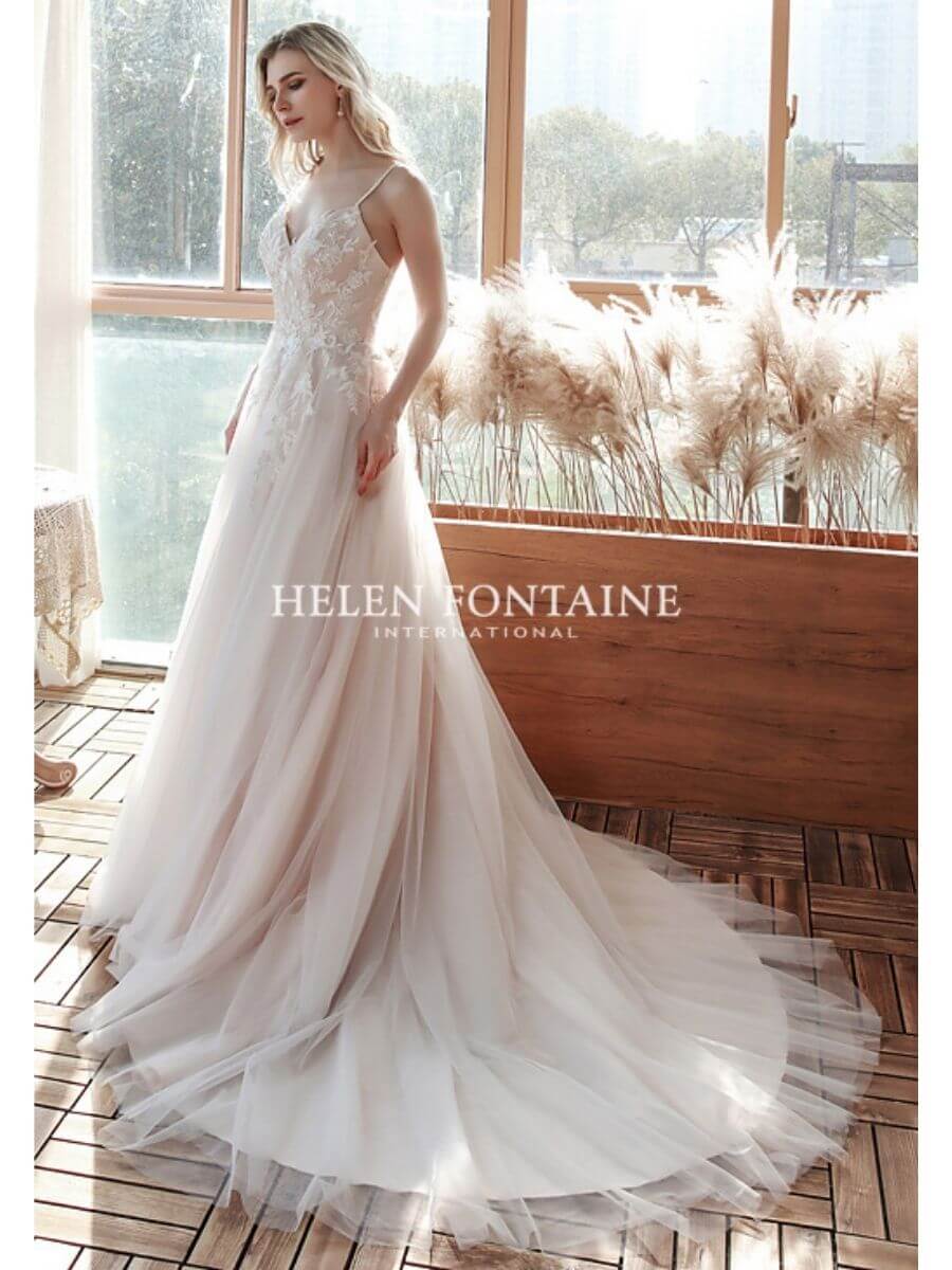 EY4187A-HF Helen Fontaine Blush A-Line Wedding Gown with Lace Motifs
