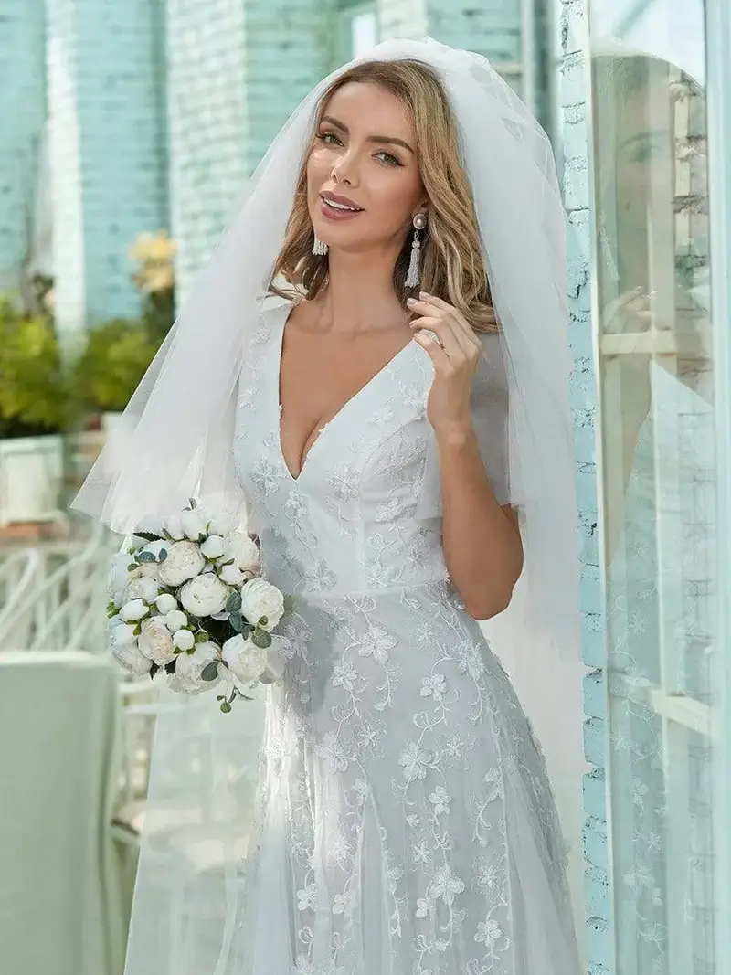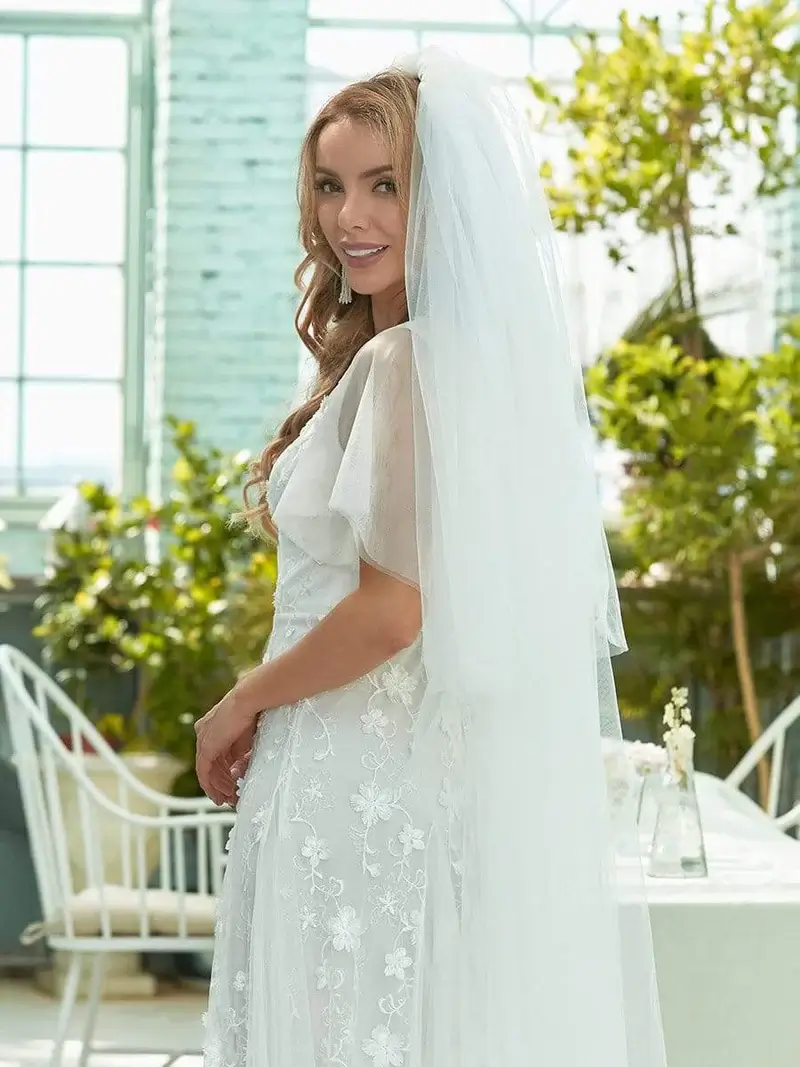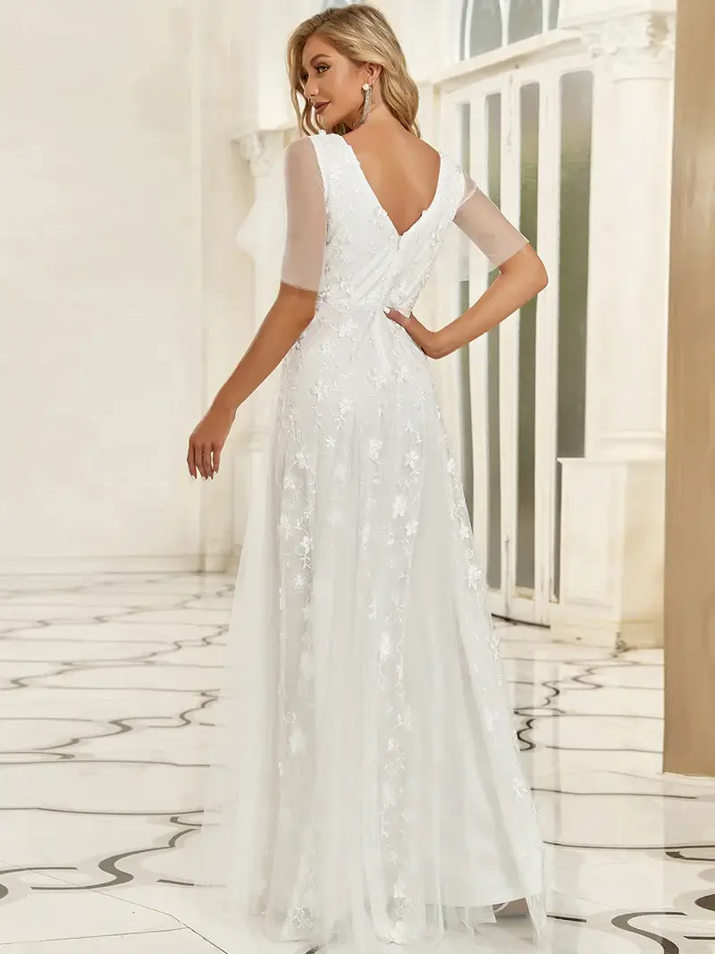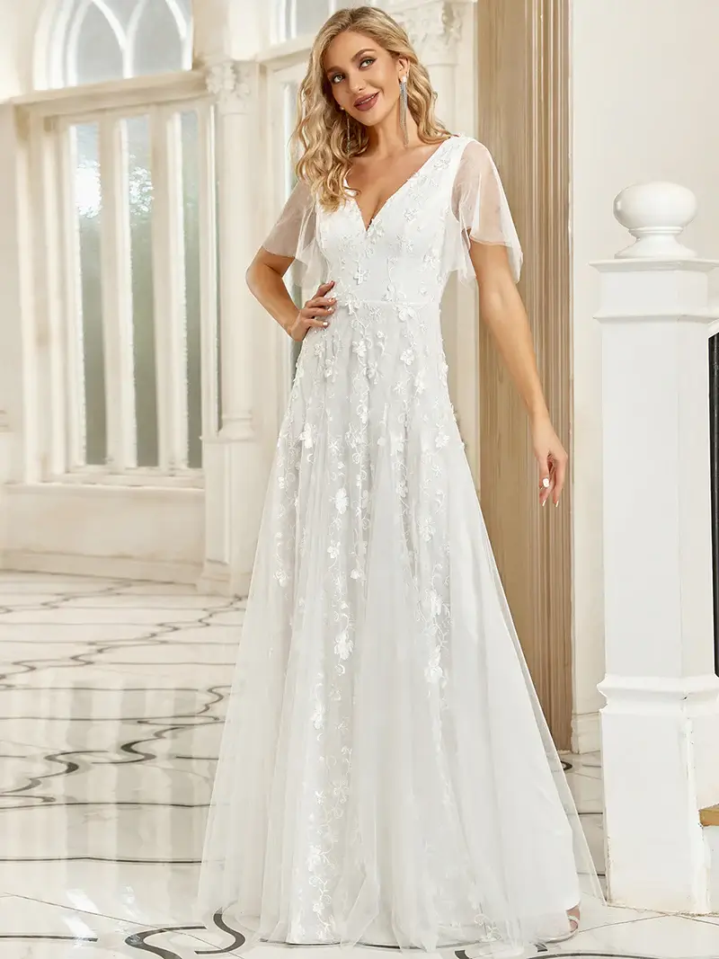 This gorgeous A-line wedding gown is designed with lace applique overlay and tulle sleeves.