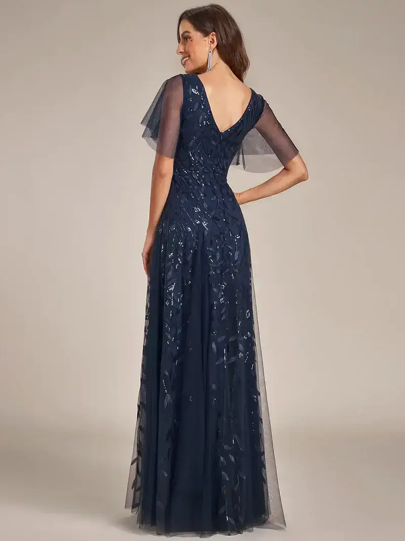 This beautiful gown features a double deep V neckline and ruffles sleeves. The shimmery leafe design gives a romantic vibe. No matter what occasion, it will make you look gorgeous and elegant. Suitable for evening party, cocktail, weddings, matric farewell and graduation!