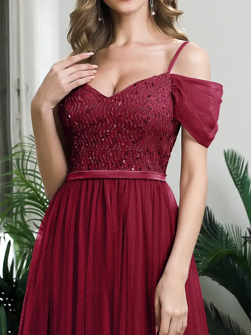 This beautiful evening gown has an A-Line silhouette, sequin bodice and off shoulders. We think this gorgeous evening gown is perfect for all formal occasions from evening party, cocktail, weddings to matric farewell and graduation!