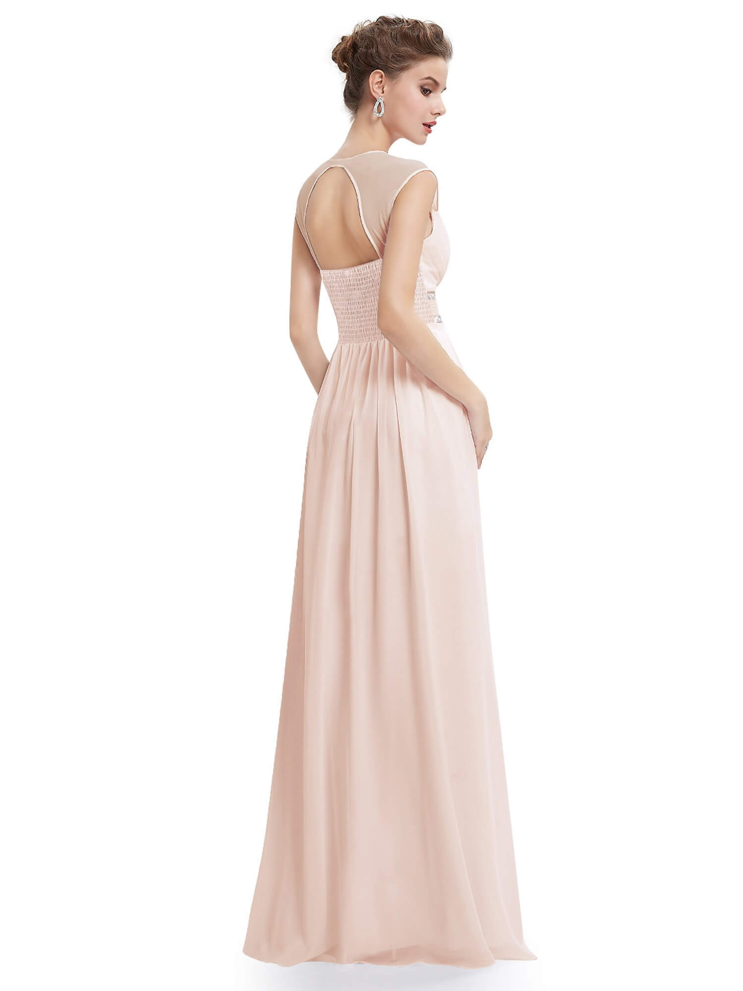 This soft flowy chiffon evening gown is perfect for any formal event. The stretch back makes it a comfortable fit so that you can dance the night away.