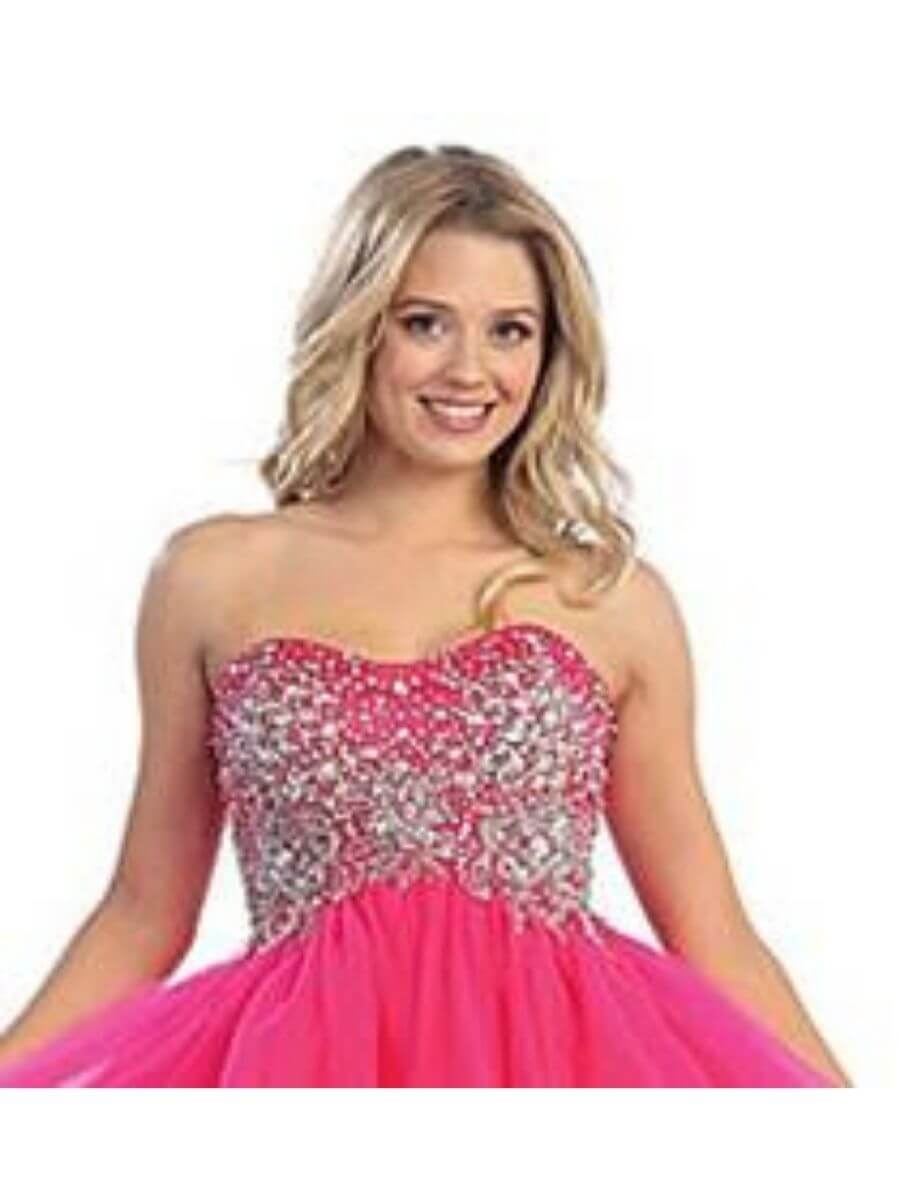 This Princess Style Strapless Diamante Encrusted Fuchsia Short Evening Gown will make you the Belle of the Ball.