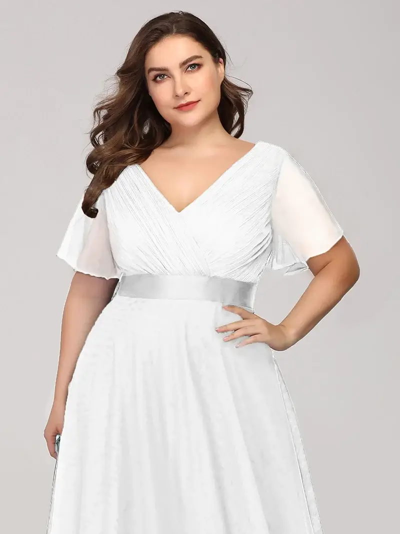 This romantic wedding gown features a deep V neckline, empire waist flutter sleeves and subtle high low tulle hemline. It is friendly to most body types.