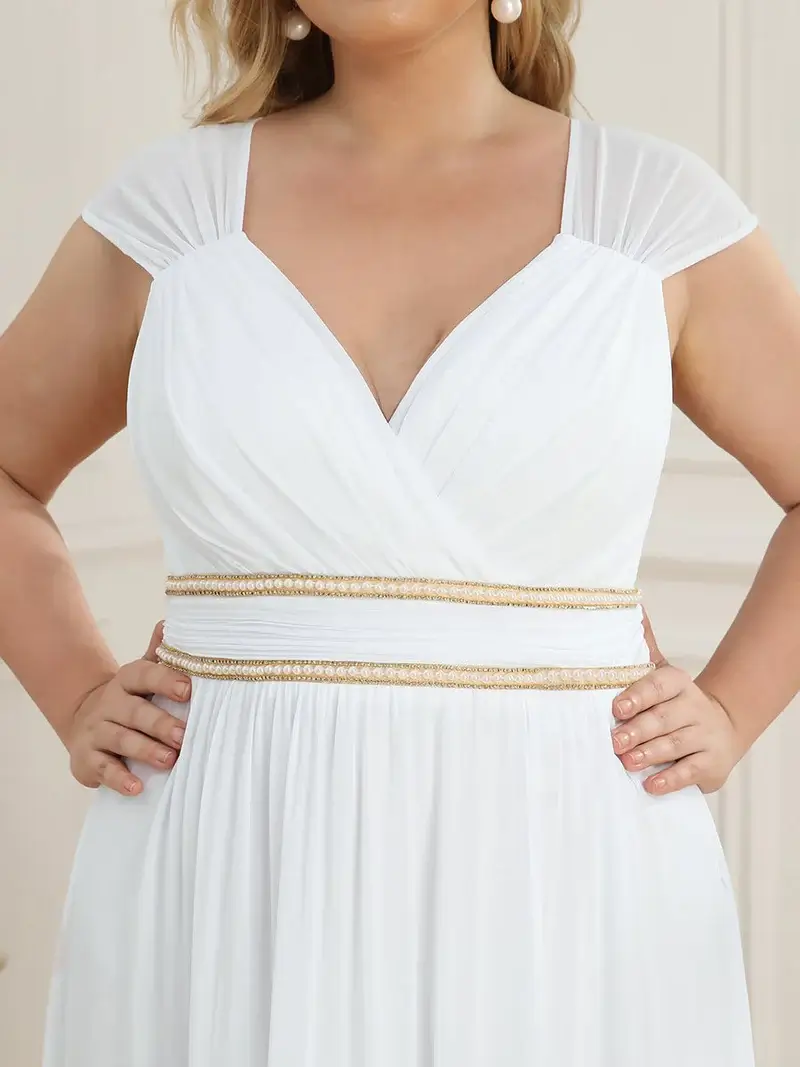 This Grecian style plus size wedding gown features an A-line silhouette, a deep V-neck and is sleeveless.