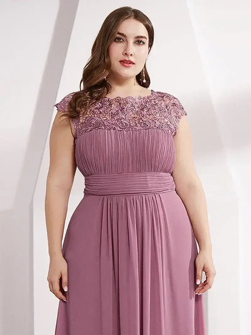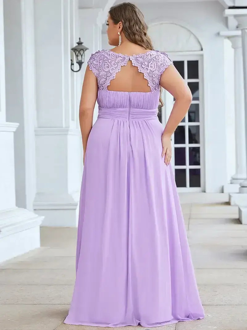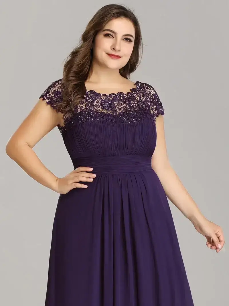 Elegant floor length plus size chiffon evening dress with lacy cap sleeves. Delicate lace and rhinestones decorate the neckline while the ruching in the bust and waist creates a figure-flattering silhouette. This beautiful evening gown is perfect for an evening party, cocktail, matric farewell, graduation, weddings, and any other formal affair!